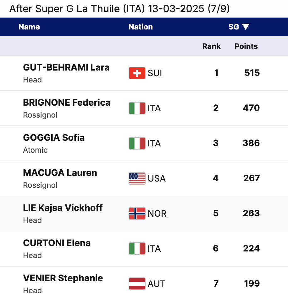 The Super-G title is now down to three skiers: Lara Gut-Behrami, Federica Brignone, and Sofia Goggia. While either Gut-Behrami or Brignone are the likely champions, Goggia still has a chance, down 129 points. However, she would need excellent finishes in the remaining races and lousy luck for Gut-Behrami and Brignone. With 200 points still possible, the final two races will determine the ultimate winner.