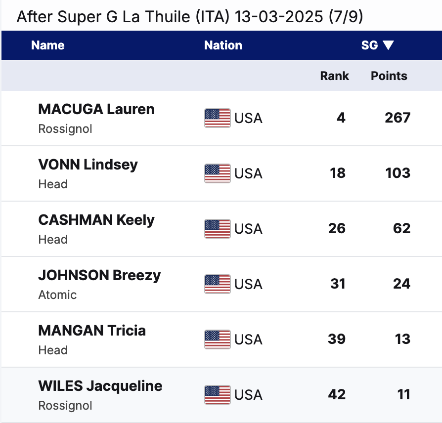 - Lauren Macuga (4th in standings) – With a super-G win this season and a tied third-place finish at the World Championships, Macuga has been consistently in the top 15. She secured fifth place in the first La Thuile super-G and is already qualified for the World Cup Finals.
