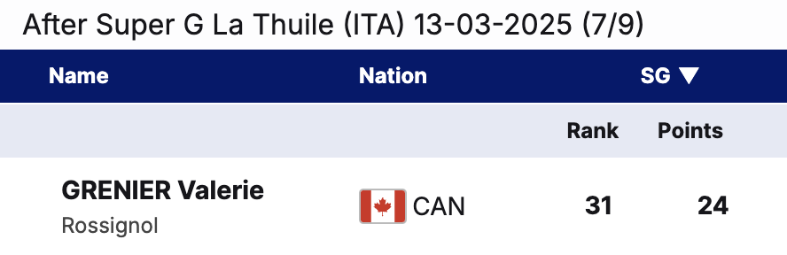 - Valérie Grenier (31st in standings) – Grenier has competed in five super-G races this season, and in the first La Thuile super-G, she finished 23rd, scoring for only the second time this season. She will be aiming for a strong result to finish the season inside the top 30.