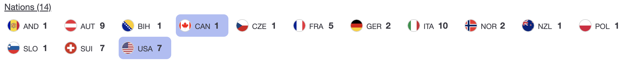 – Italy (ITA) – 9 podiums, 2 racers: Sofia Goggia, Federica Brignone