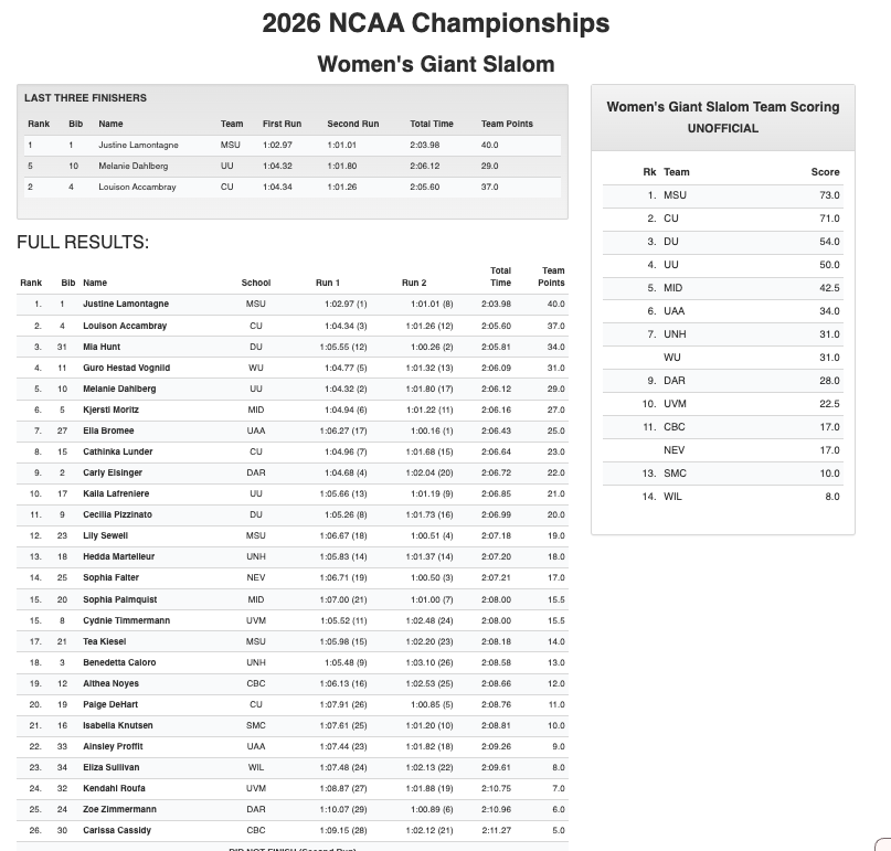 “It was really fun out there today,” Lamontagne said after the race. “It felt like a great way to finish my senior season. The venue was awesome and the GS course was really fun to ski. I had a really solid first run and knew I just needed to put down another strong run in the second, so I’m really happy with how it all came together.”