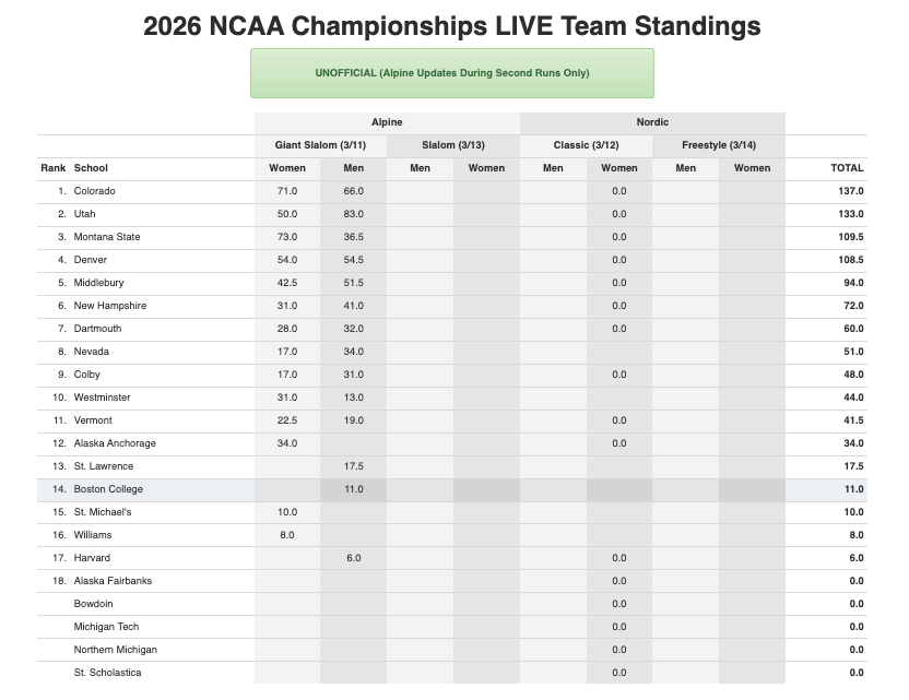 After the opening alpine events, Colorado leads the team standings with strong results from both the women and men. Utah sits in second, powered by an especially strong men’s performance, while Montana State holds third following an impressive day from their women’s squad. Denver remains close in fourth, with Middlebury rounding out the top five as the championships move into the Nordic portion of the competition.