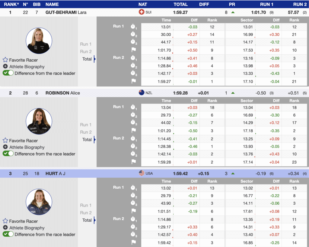New Zealand’s Alice Robinson was the first of that group to ski. She attacked and delivered an impressive power performance but crossed into second only (+0.01) behind the Swiss leader. It was then that Gut-Behrami knew she had achieved a podium.
