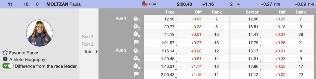 The first Stifel US Ski Team member to ski the second run was Paula Moltzan. Moltzan was ranked 13th after the first run. She delivered an excellent run but crossed the finish into 2nd with 12 skiers yet to ski. Moltzan, however, ended the day with a strong 11th (+1.16).