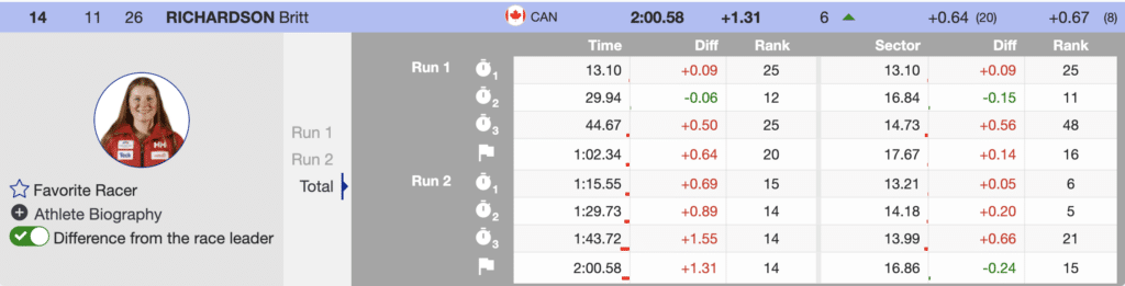 The Canadian Junior World Champion, Britt Richardson, was the 11th skier to attack the second course. She revealed her elite skiing is continuing. During the final run, she moved up six positions and finished 14th (+1.31). Today’s Soldeu result improves her credentials for her first invitation to the World Cup finals.
