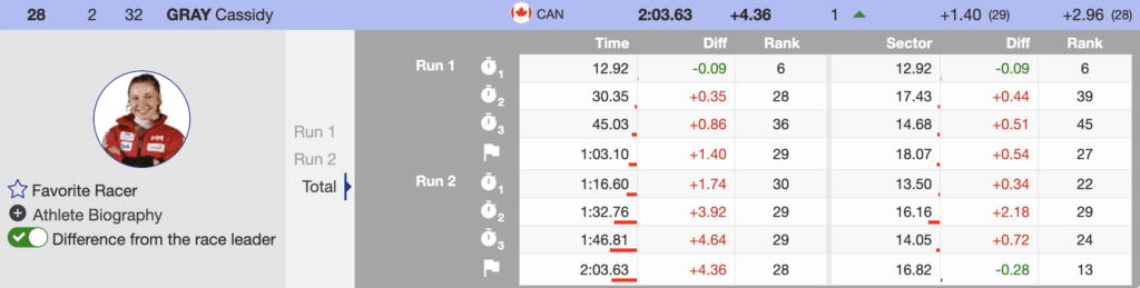 Candian Cassidy Gray was the first of the North Americans to ski the final run. It was her fourth time qualifying for the second GS run this season. Although she made a big mistake in a problematic delay gate, she finished and scored points for the third time this season—the fifth time in her career.