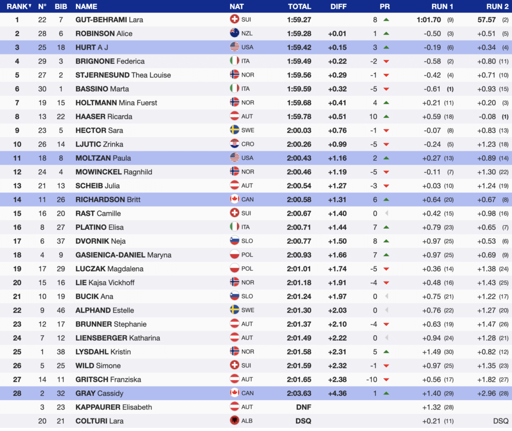 The most significant second-run improvement came from Austrian Ricarda Hasser. After finishing the first run 18th, she delivered the fastest second run to move up ten positions to finish a season-best eighth.