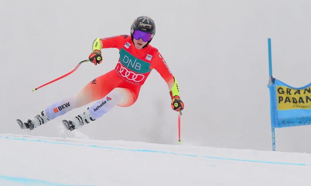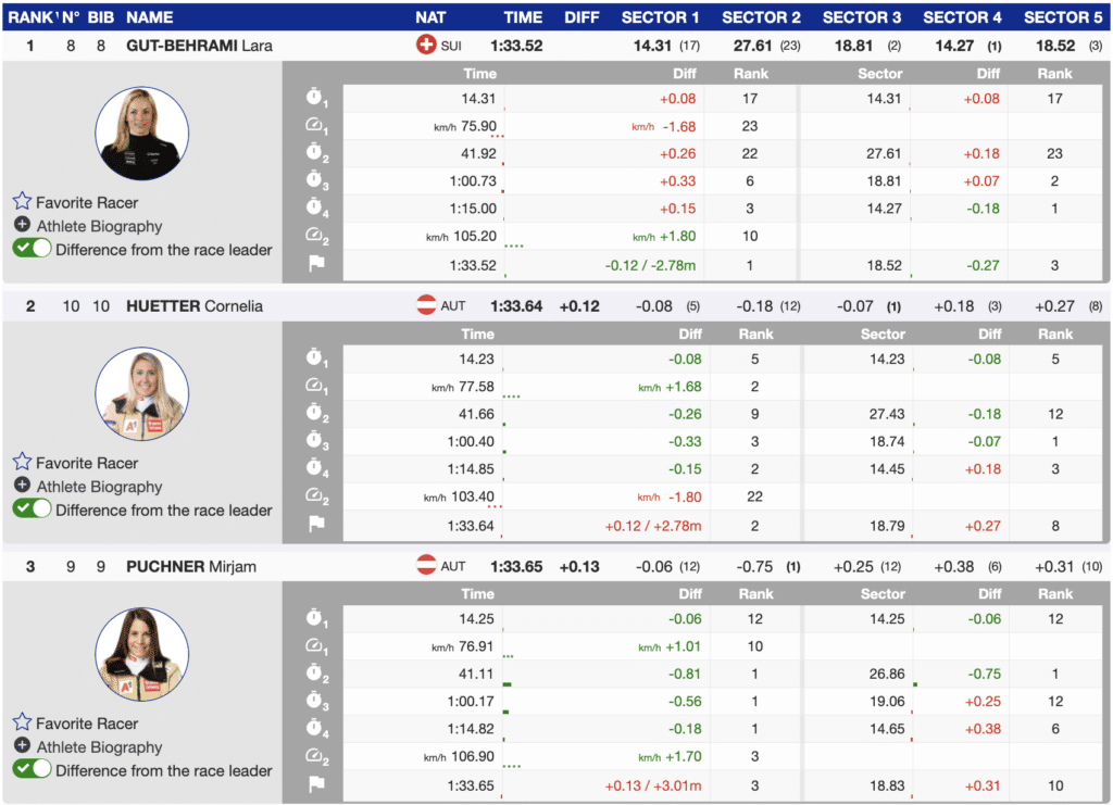 Hütter was ahead of Gut-Behrami’s time throughout the entire course, until the last gliding section, where she lost some time that cost her the win. She came through the finish only +0.12 behind the super-G leader.