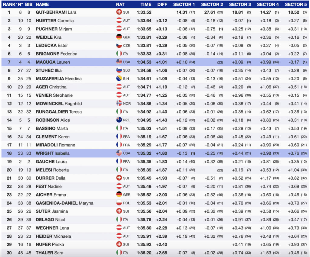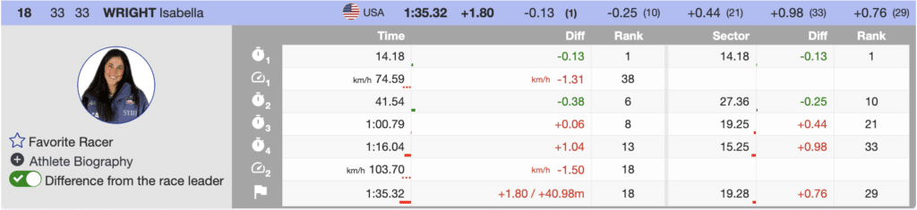 Her teammate, Isabella Wright, came out of the start gate attacking. She had the fastest two starting intervals, but her intervals widened from Gut-Behrami’s lead in the mid-section of the course. Unfortunately, she lost more time in the last gliding sections. She finished the day in 18th place.