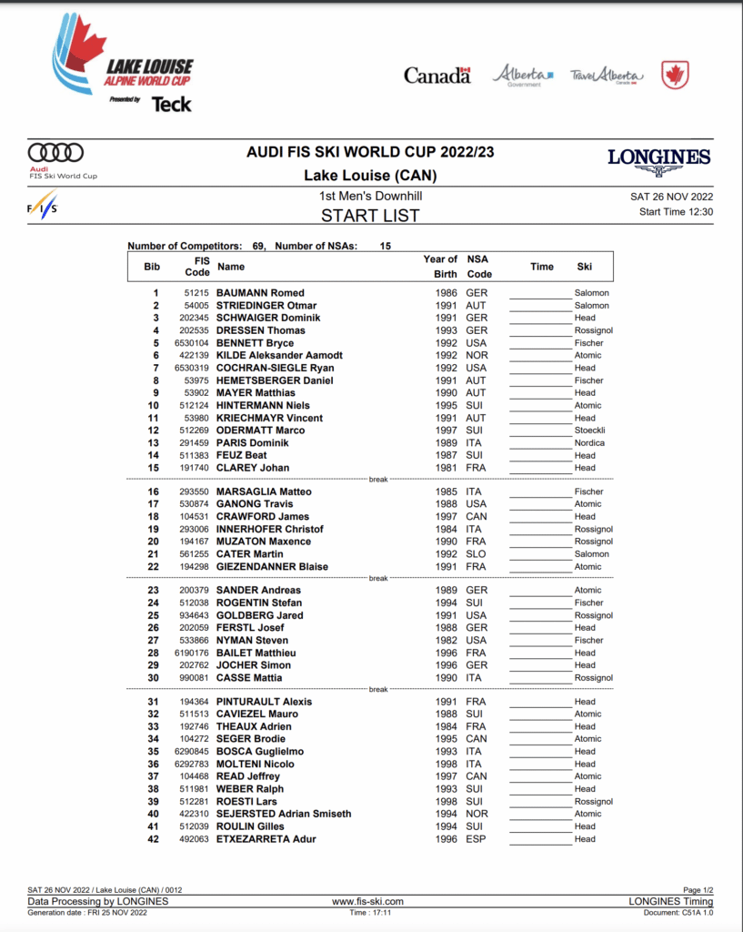 Hopefully, the 2022-23 World Cup men’s speed events begin tomorrow, November 26th, in Lake Louise, Canada. The single-run race will start at 2:30 pm Eastern and 11:30 am on the West Coast. The Stifel US Alpine Team will enter seven of their best adrenalin addicts. Additionally, the Canadians have entered their best six.