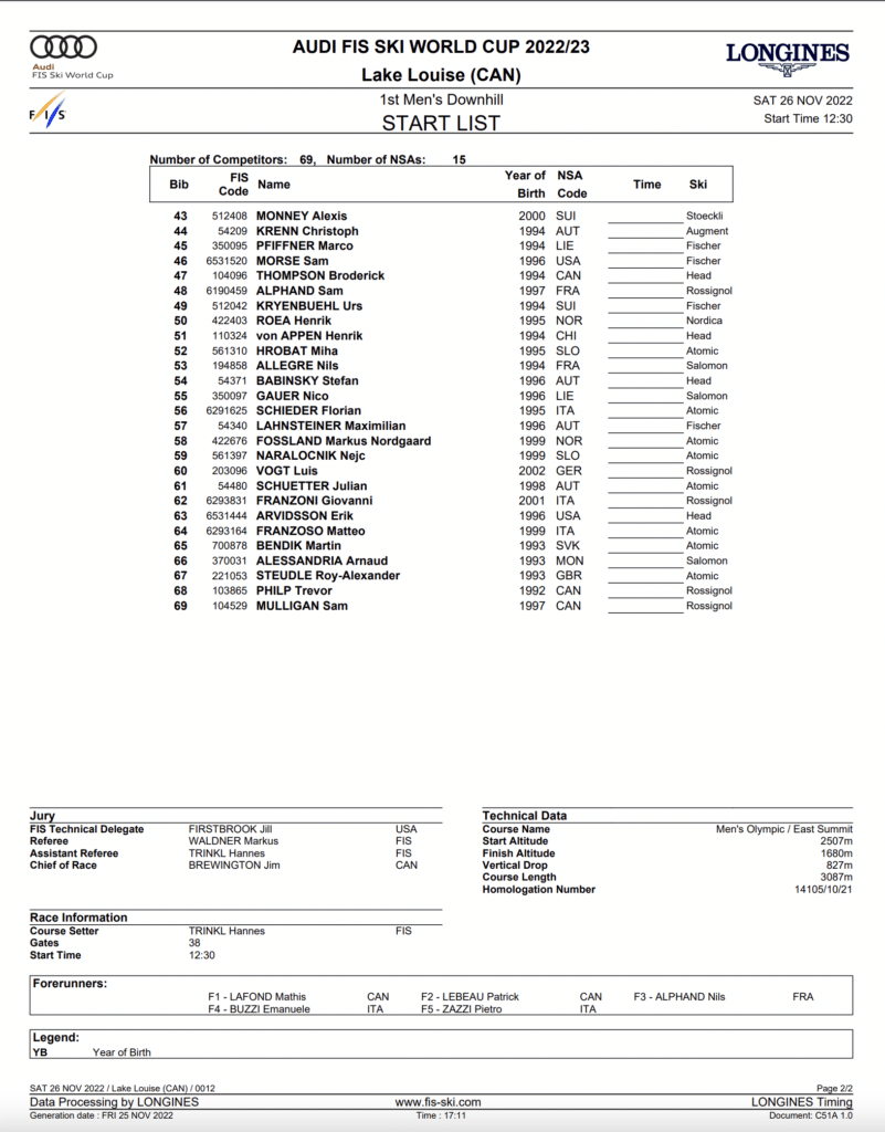 The list of North American adrenalin addicts entered in the 11/26/22 downhill
