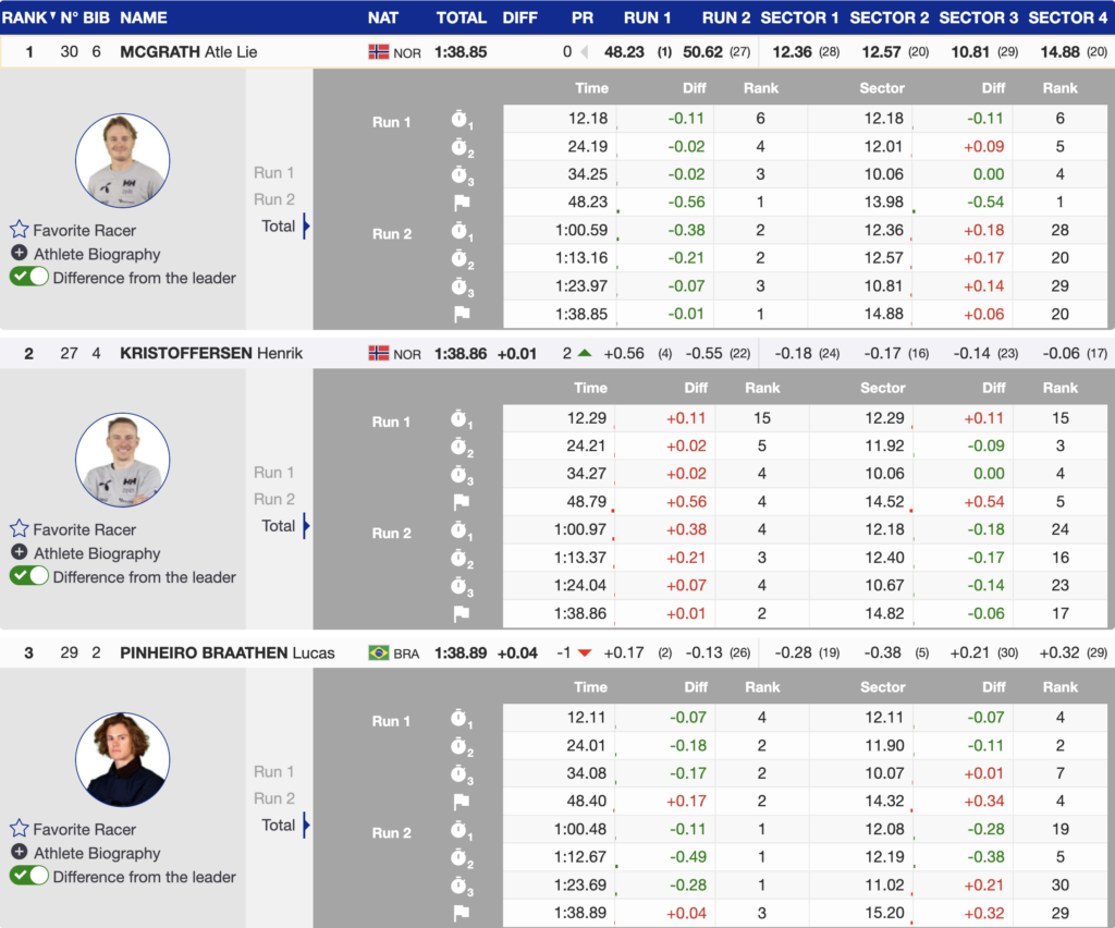 Brazil’s Lucas Pinheiro Braathen finished third, only 0.04 seconds behind the winner, meaning the entire podium was separated by just four hundredths of a second.