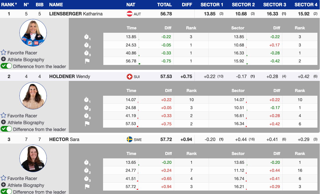 Ultimately, seven skiers with bibs above 30 qualified for the second run. The fastest was Italy’s Marta Rossetti, wearing bib 31, who finished 2.47 seconds back in 15th place. Japan’s Asa Ando, racing with bib 60, was the final skier with a bib above 30 to qualify. Ando crossed the line 3.07 seconds behind Liensberger, securing 26th place. Her huge smile and joyful scream earned the enthusiastic approval of the Austrian fans. The time spread between the fastest and the 30th was 3.39 seconds.