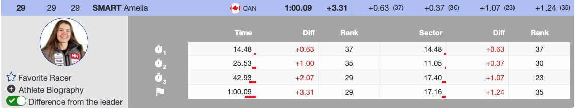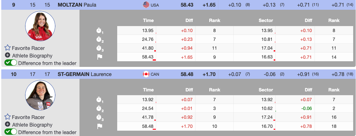 The first Canadian to ski was reigning world champion Laurence St-Germain. After missing the last race in Kranjska Gora due to back issues, she showed no hesitation in skiing fast. Although she was just 0.01 seconds behind through the second timing sector, she could not maintain that momentum and crossed the line one spot behind Moltzan, finishing tenth.