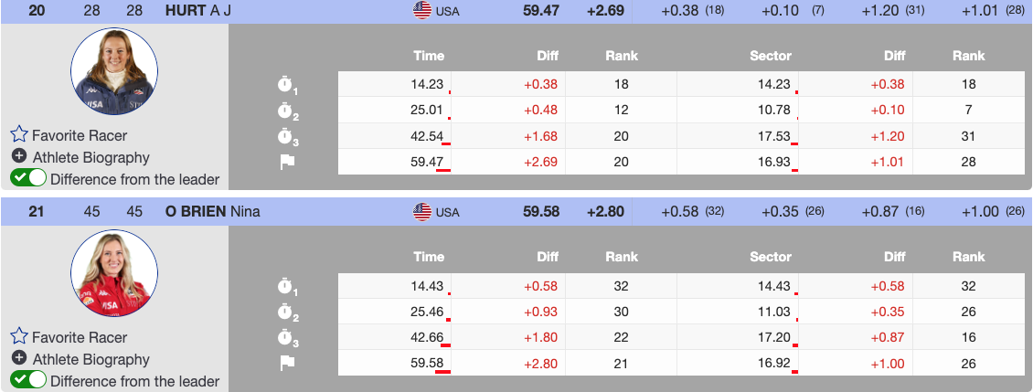 Once the first 30 racers had completed their runs, three had failed to finish, and one had been disqualified. With a few others struggling to finish without big mistakes, including Ljutić, there was ample opportunity for higher bibs to qualify. One racer who took advantage was the Stifel U.S. Ski Team’s Nina O’Brien. She delivered solid slalom skiing throughout the course, crossing the finish line 2.80 seconds back. O’Brien finished 21st, just behind her teammate Hurt.