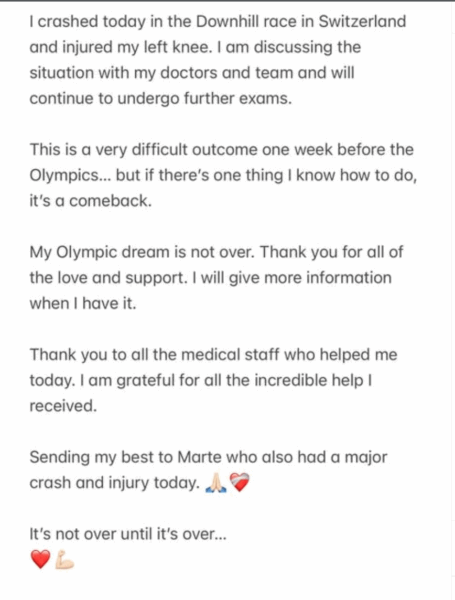 Lindsey Vonn shared an update on Instagram after crashing during today’s downhill training run in Switzerland. She sustained an injury to her left knee and is currently undergoing further medical examinations while consulting with her doctors and team.