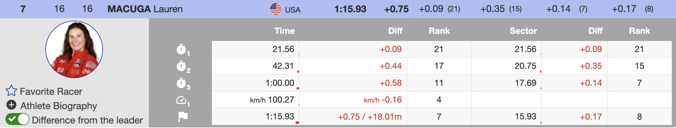 Wearing bib 16, the young American delivered another standout performance. Skiing with powerful aggression and confidence, she crossed the finish line in a temporary tie for sixth place with Czech skier Ester Ledecká. By the end of the day, Macuga secured her fourth career top-10 super-G result, finishing tied for seventh.