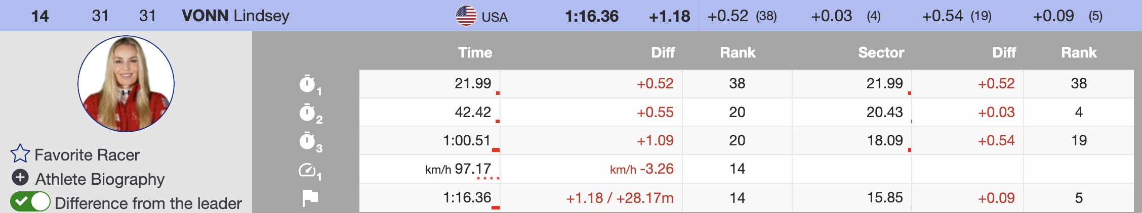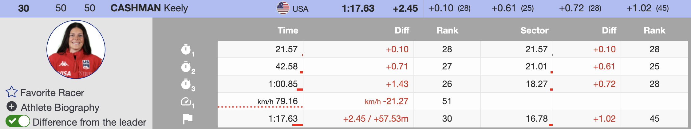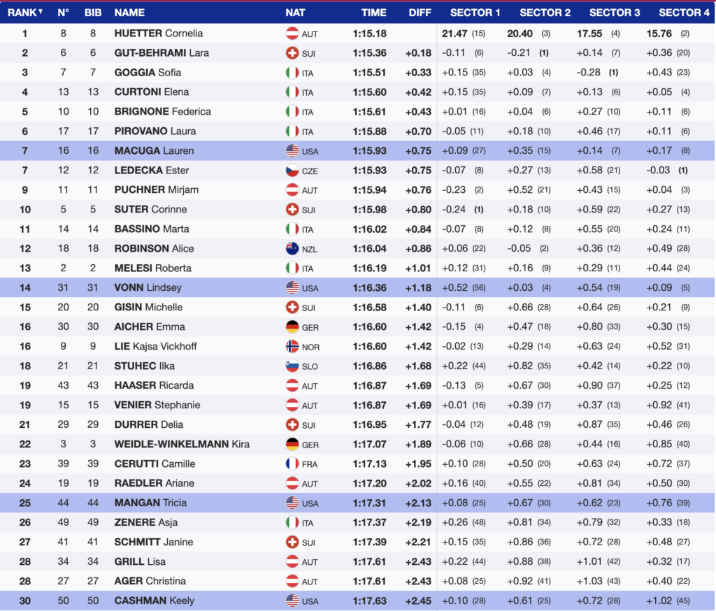 Seven women starting with bibs above 30 managed to score in today’s St. Moritz super-G. The last to do so was Cashman, who finished 30th, 2.45 seconds behind the winner. The best result from this group came from her teammate Vonn, who secured 14th place, finishing 1.18 seconds back.