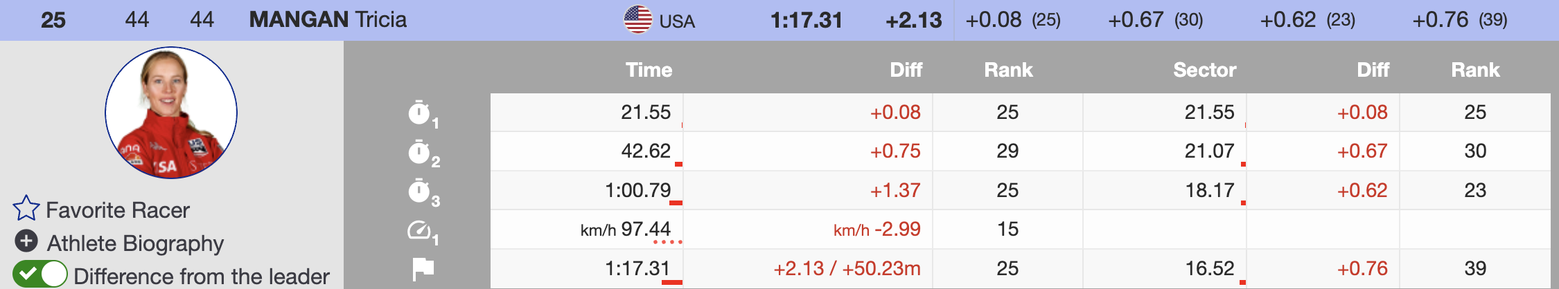 Stifel U.S. Ski Team member Tricia Mangan failed to ski well enough to score in Beaver Creek but found another gear in St. Moritz. Mangan delivered a solid run, finishing 2.13 seconds behind the Austrian winner. Her performance earned her first World Cup points of the season, marking the third time she has scored in super-G in her career. Mangan finished 25th.