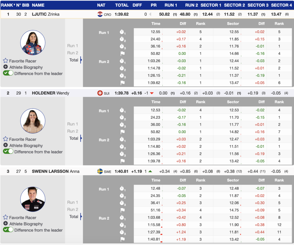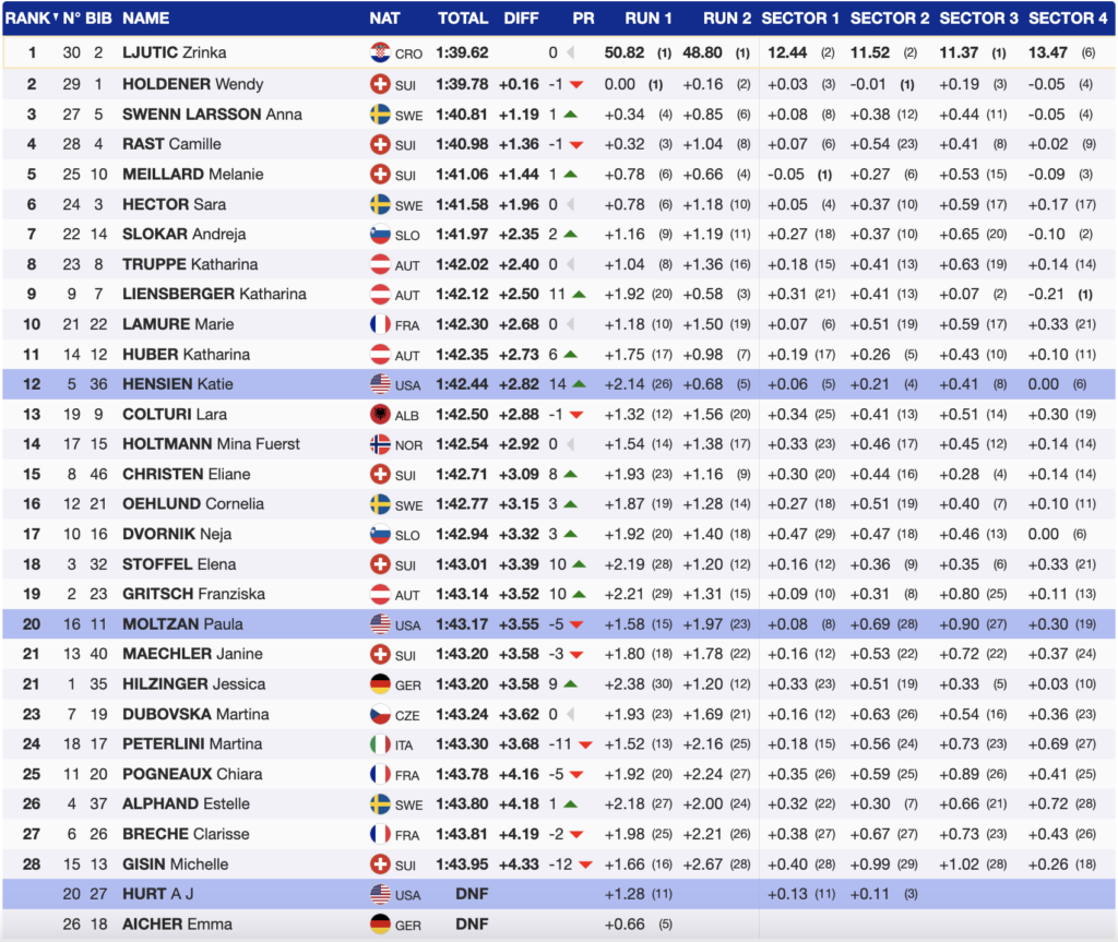 As the 20th skier, AJ Hurt of the Stifel U.S. Ski Team, who skied fast, could not finish her second run, ten competitors remained. The leaderboard stayed unchanged, with Austria’s Liensberger leading, followed by teammate Huber and Hensien in third.