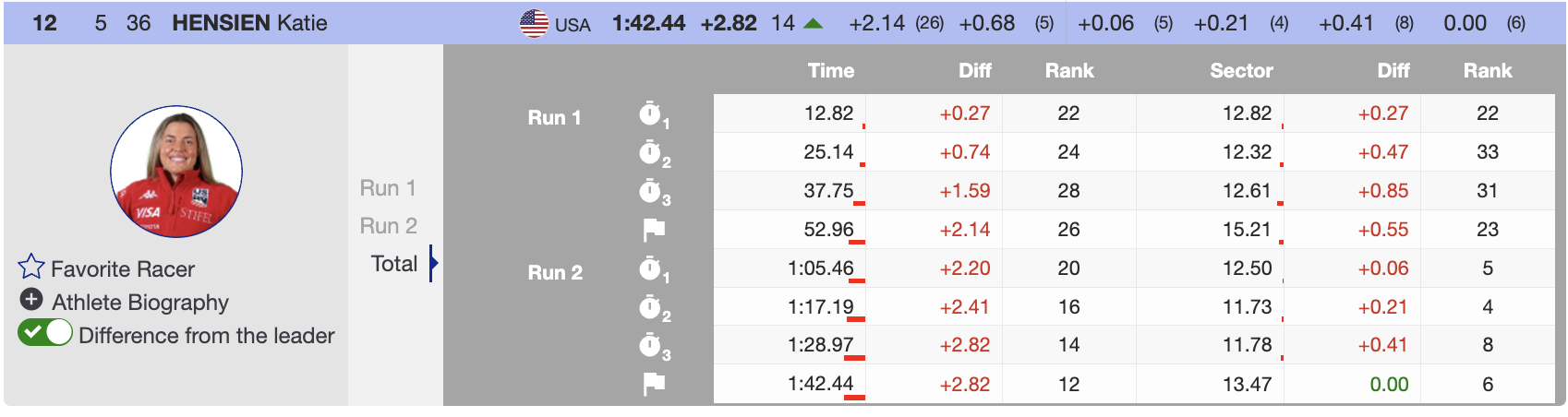 Katie Hensien qualified for her first second-run slalom appearance of the season and was the fifth skier to tackle the afternoon course. Taking full advantage of favorable conditions, she skied aggressively and maximized her opportunity to improve her standing. Crossing the finish line with the fastest combined time at that point, Hensien began her climb up the leaderboard. By the end of the race, she had moved up 14 positions to achieve a career-best slalom result, finishing 12th and making a significant stride in her season.