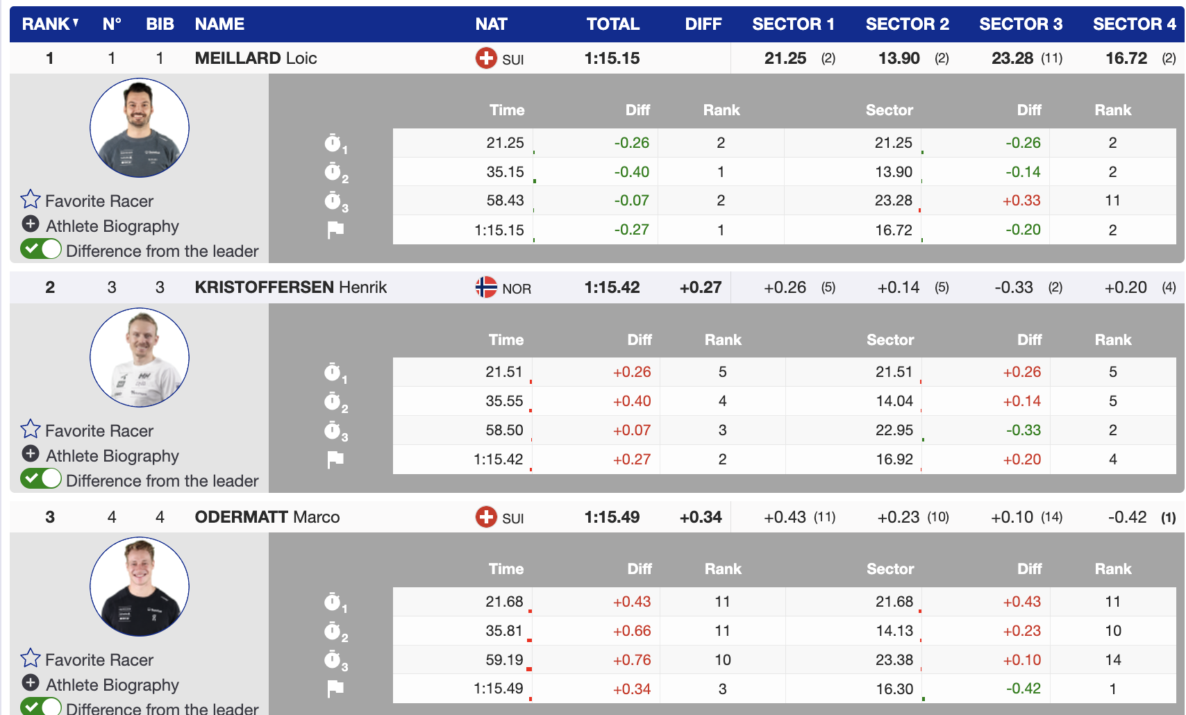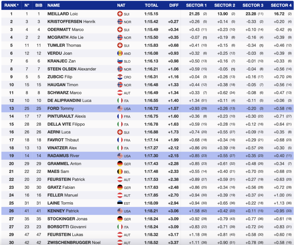 With a bluebird day, his teammate, Loïc Meillard, took advantage of bib 1. Meillard was determined to redeem himself after his straddle in the slalom yesterday. He charged down the course with intensity and managed to clock the fastest time for the first run at 1:15.15.