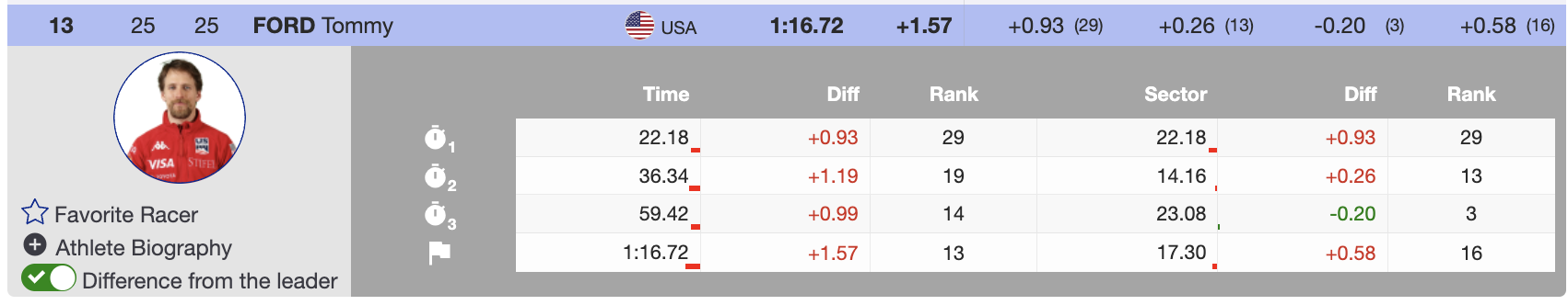Stifel US Ski Team athlete Tommy Ford heads into the second run as the fastest North American. He is in 13th place, +1.57 behind the lead. He will be gunning for a spot in the top 10 on the second run.