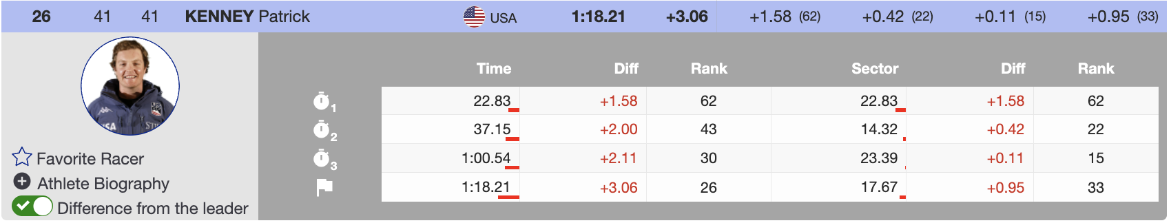 The Independent Global Racing athlete, Patrick Kenney, kicked out of his 16th World Cup start wearing bib 41. He skied with strength from the top to the bottom and geared up in the final section of the course. He heads into the second run in 26th position, +3.06 behind the lead.