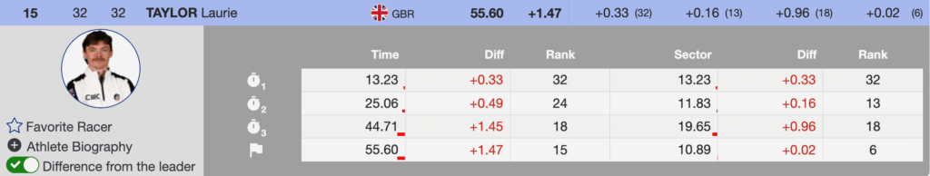 - Laurie Taylor (GBR) — bib 32 — 15th, +1.47