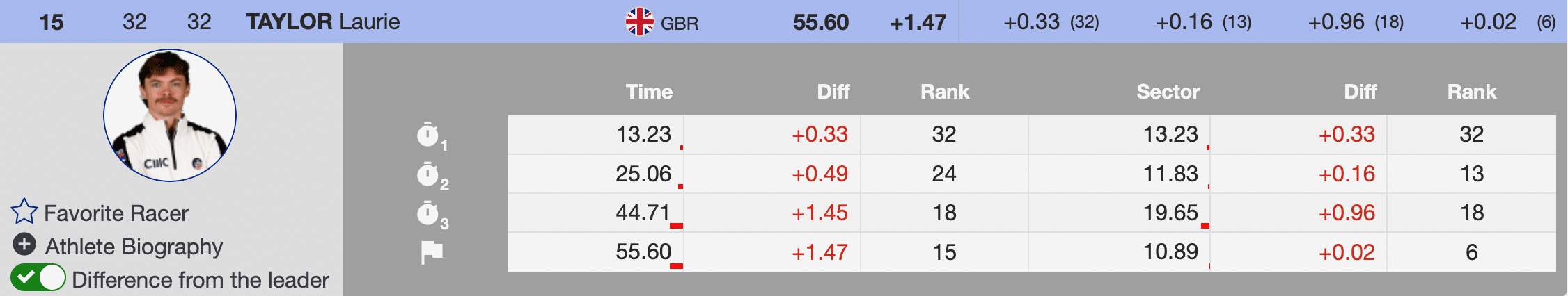 - Laurie Taylor (GBR) — bib 32 — 15th, +1.47