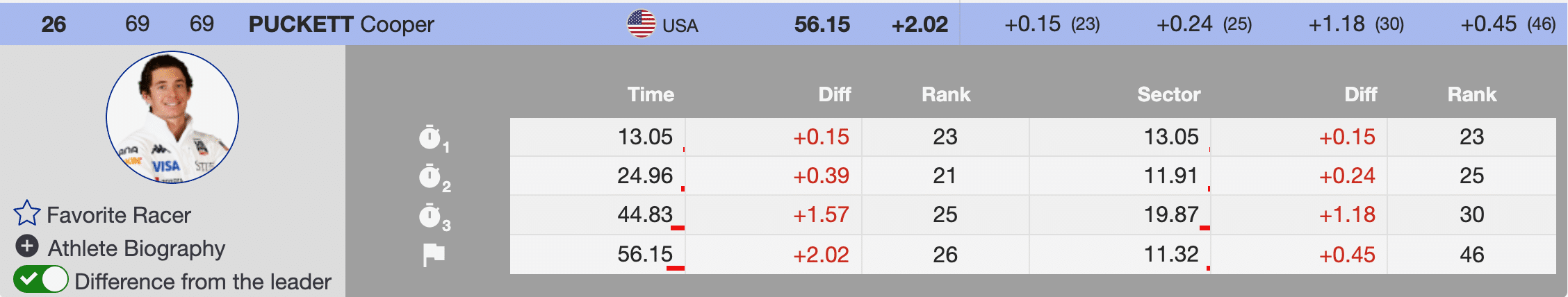 - Cooper Puckett (USA) — bib 69 — 26th, +2.02
