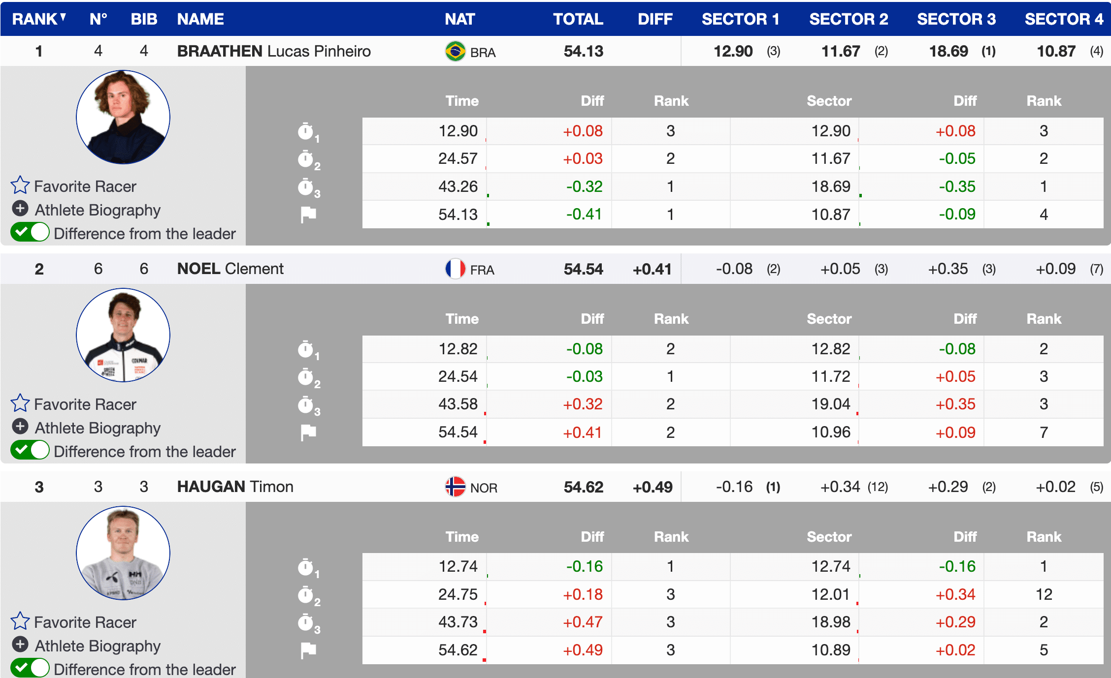Rounding out the fastest three were Clement Noël (+.41) and Timon Haugan, (+.49) who sit second and third, respectively. Noël trails Braathen by 0.41 seconds, managing the set well and looking poised to challenge in the second run. Haugan sits comfortably in third, keeping the Norwegian flag flying high and setting the stage for an exciting final push. With tight margins and a high-quality surface for run two, all eyes will be on how the top contenders respond to the rising stakes.