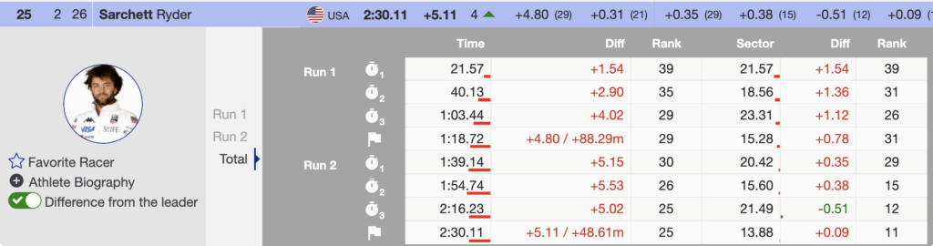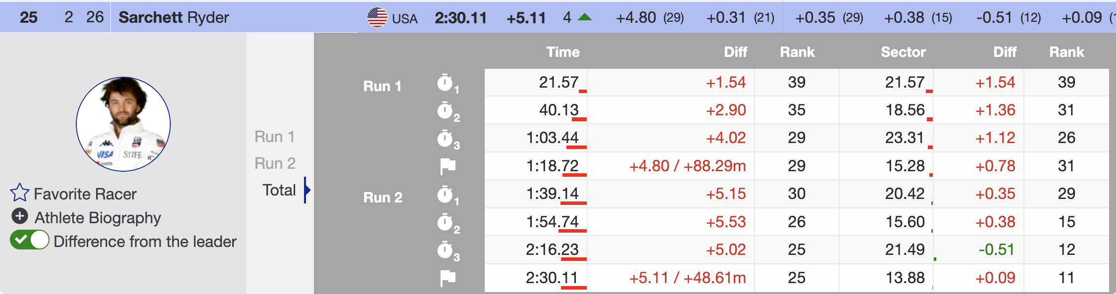 Competing in his first Olympics, Sarchett rebounded from a disappointing first run with a strong second.