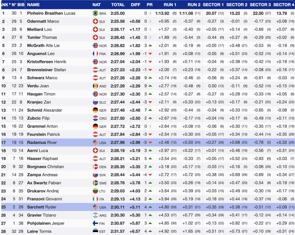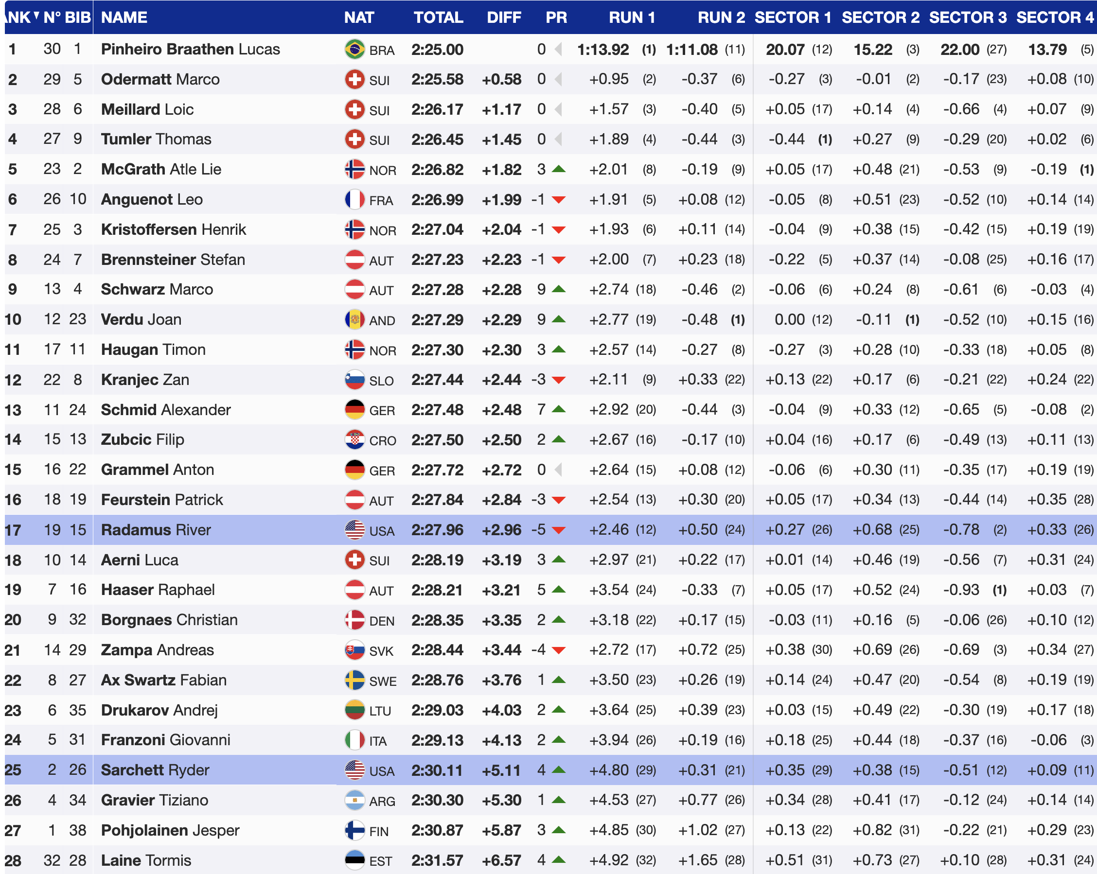 - 🥇 🇧🇷 Lucas Pinheiro Braathen (BRA, 2000) — 2:25.00