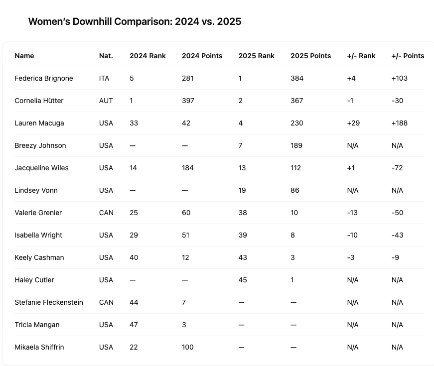 Ten North American women scored World Cup downhill points in both 2024 and 2025. But the makeup changed. One fewer Canadian earned points this season, while one more American—independent skier Haley Cutler—broke through. She earned her first career World Cup point in Kvitfjell.