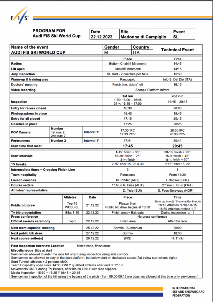 Program for the December 22nd Madonna di Campiglio slalom