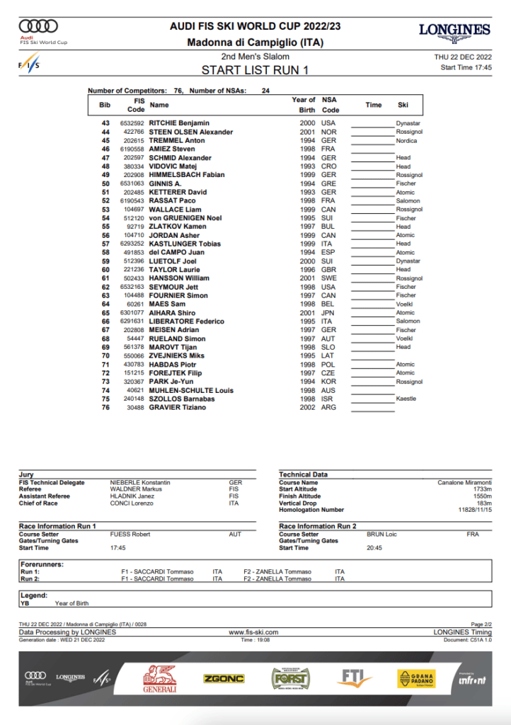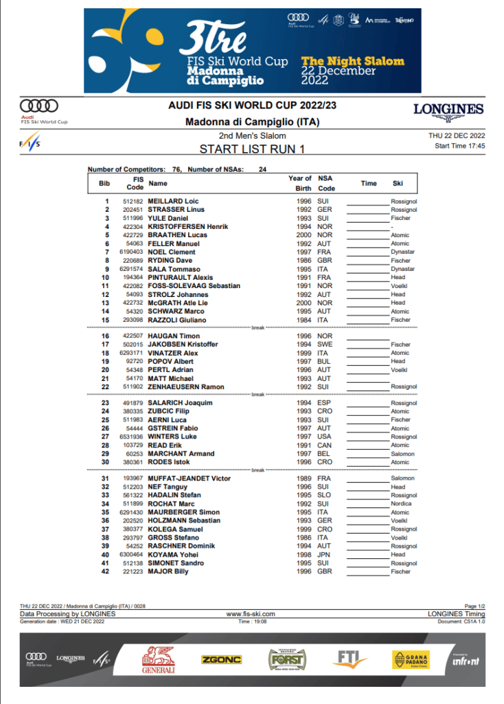 Start list and program for the December 22nd Madonna di Campiglio slalom