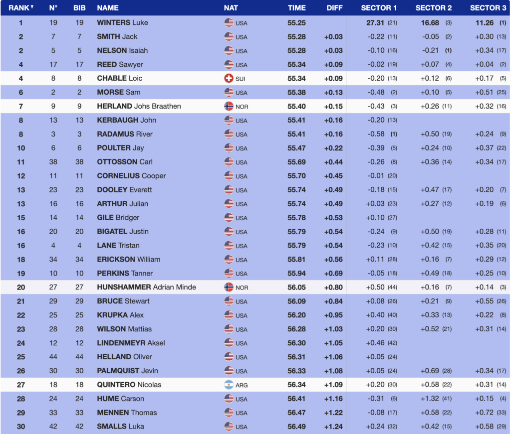 Just 0.22 seconds separated the top 10 in one of the closest U.S. Nationals super-G races in recent memory. Loïc Chable of Switzerland placed fourth, 0.09 seconds back, followed by Tanner Perkins in fifth. Sam Morse — who lent Winters the skis — finished sixth.