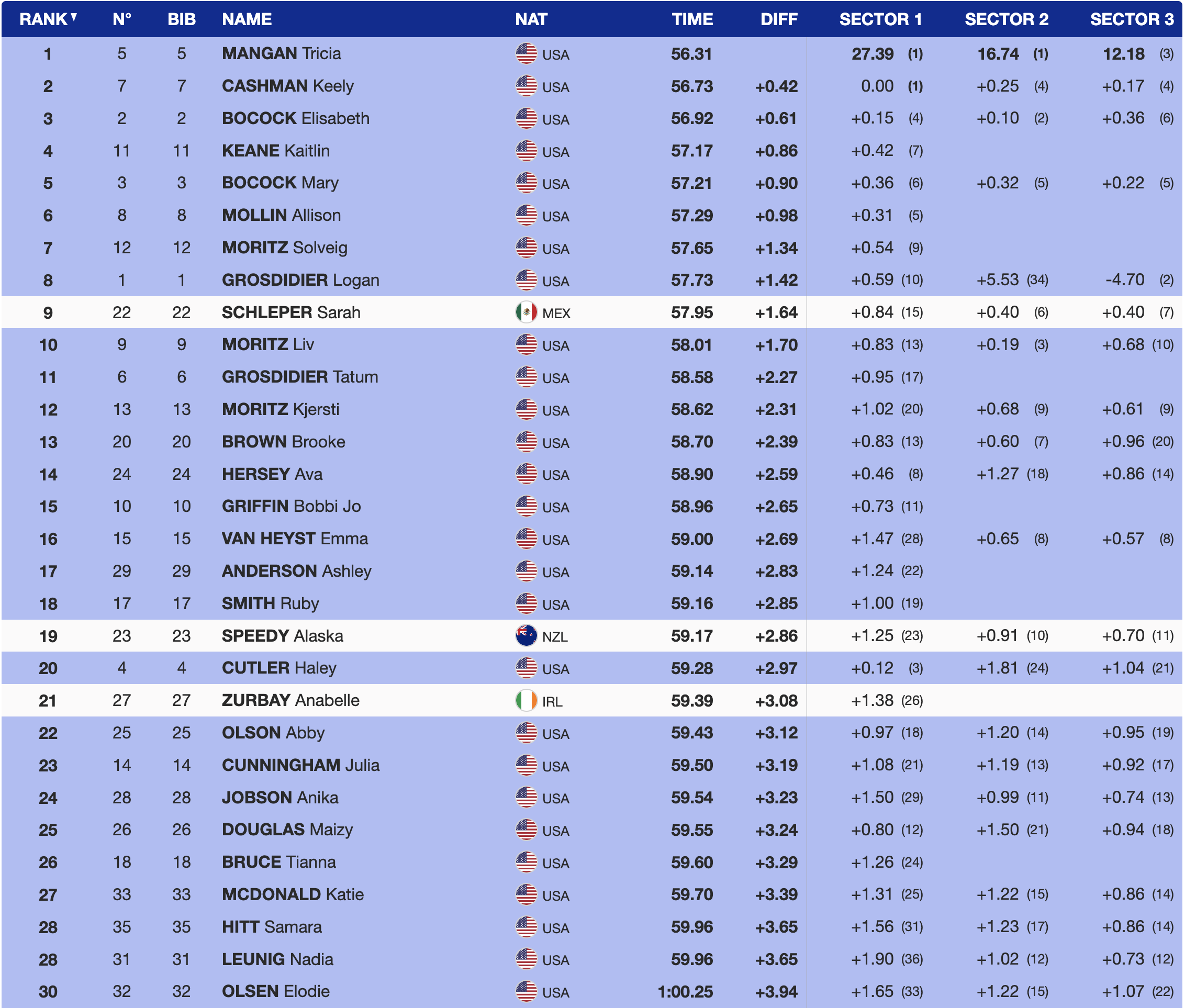 Mangan led a sweep of the top six spots by athletes with World Cup experience. Keely Cashman, the 2023 national downhill champion, finished second, just 0.42 seconds off the lead. Elisabeth Bocock, who won last year’s super-G title, took third, 0.61 back.