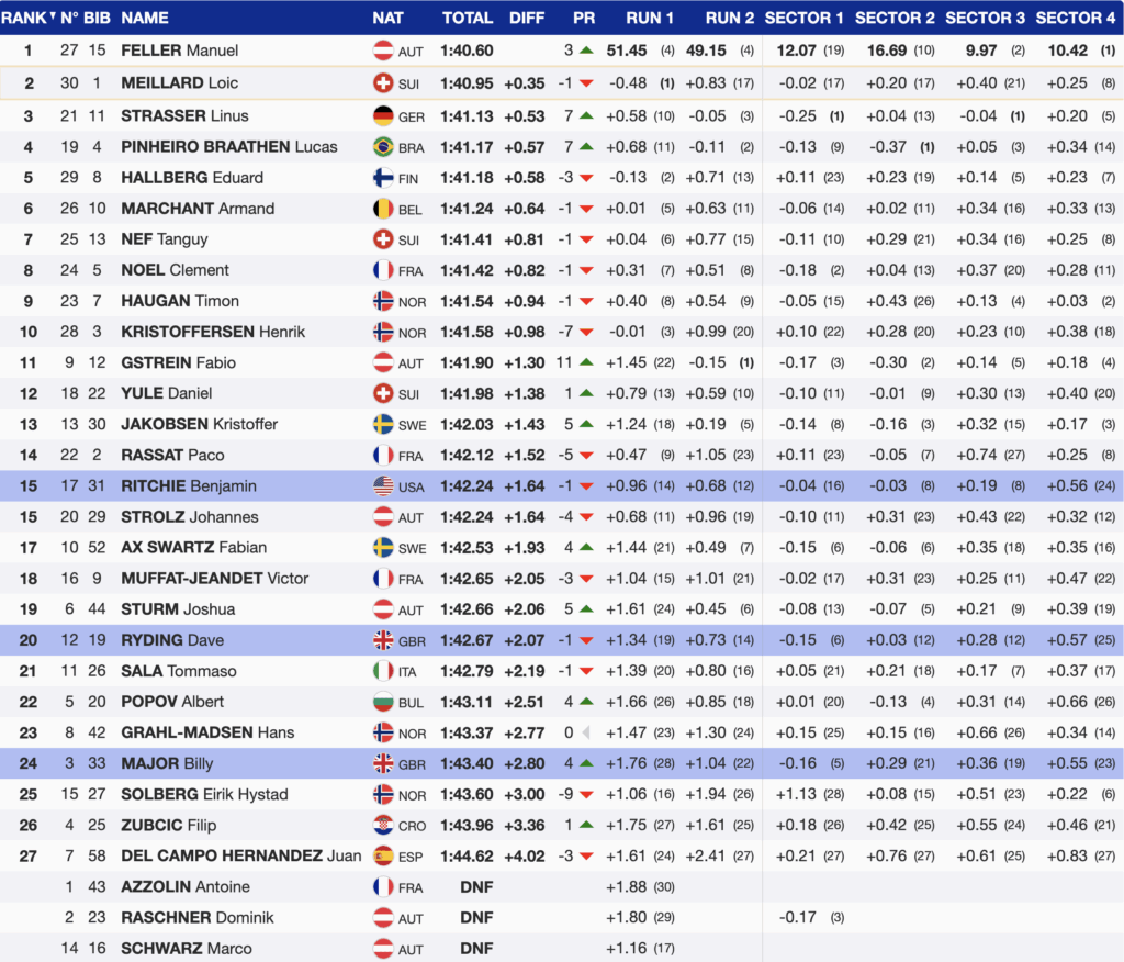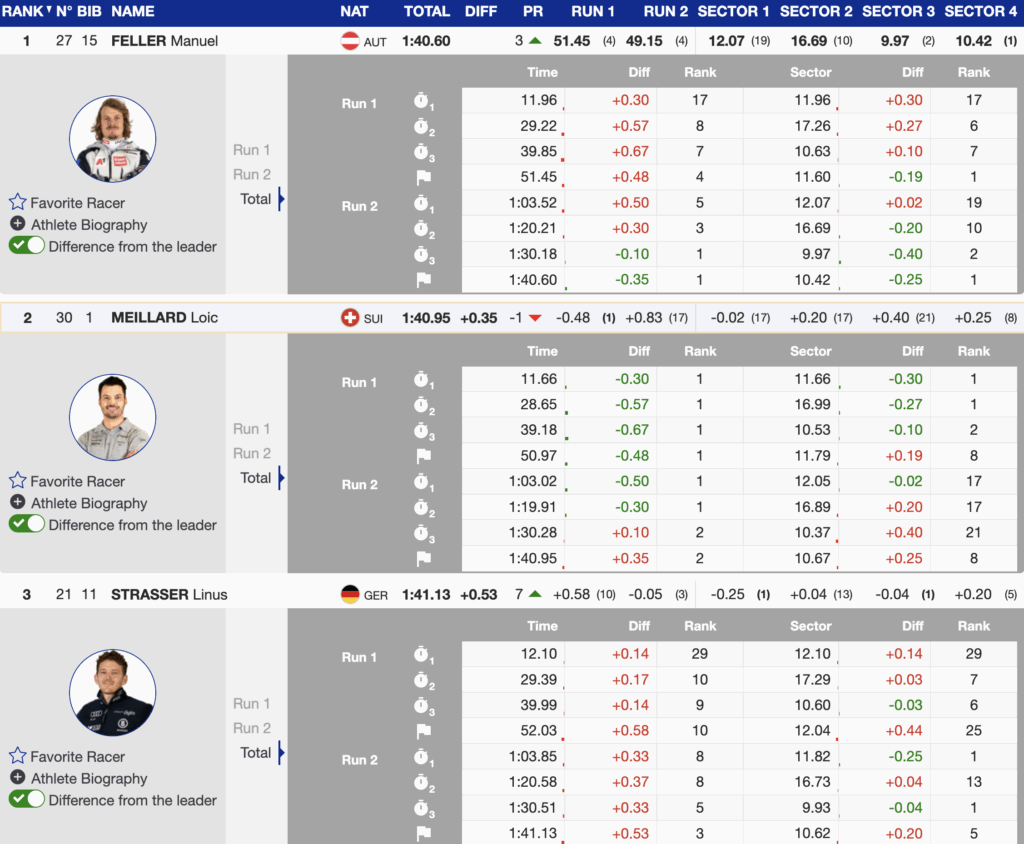 First-run leader Loïc Meillard entered the second run with a 0.46-second advantage over Feller and extended slightly in the opening sector. But he lost time through the middle of the course and crossed the line 0.35 seconds back, posting only the 17th-fastest second run and showing clear disappointment despite finishing second.