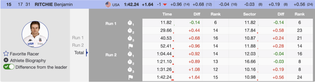 - 2nd — 🇨🇭 Loïc Meillard (SUI) | YOB 1996 | +0.35 |