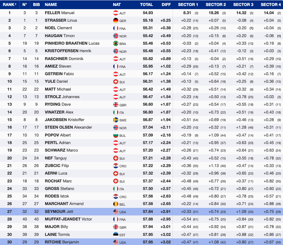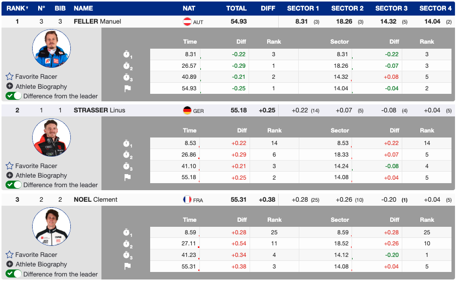Strasser also gained some confidence back after his 6th place in Madonna Di Campiglio this week, as he failed to score points in the previous three races. He heads into the second run +0.25 behind Feller.