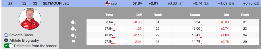 The Stifel US Ski Team athletes Jett Seymour and Benjamin Ritchie will be the two to advance. Jett Seymour will have a better starting position for the second run, achieving 27th place in the first (+2.91). Benjamin Ritchie will join him and run first on the second run (+3.02).