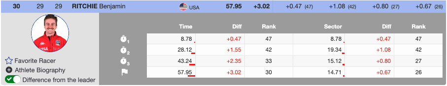 Unfortunately, Erik Read of Alpine Canada Alpin just missed the top 30, finishing the first run in 32nd place.