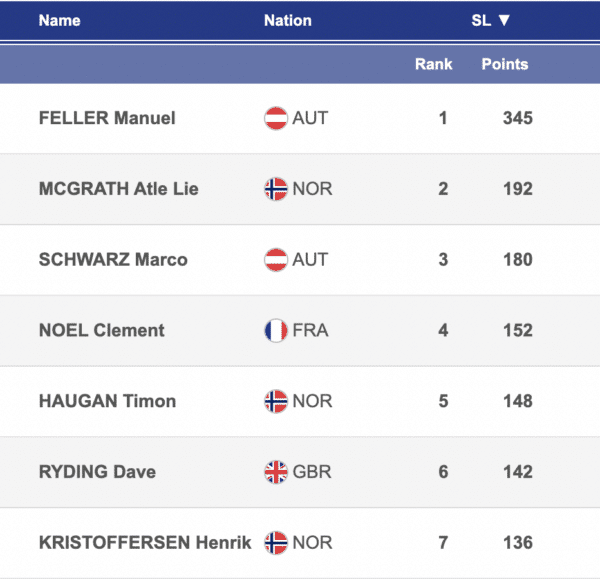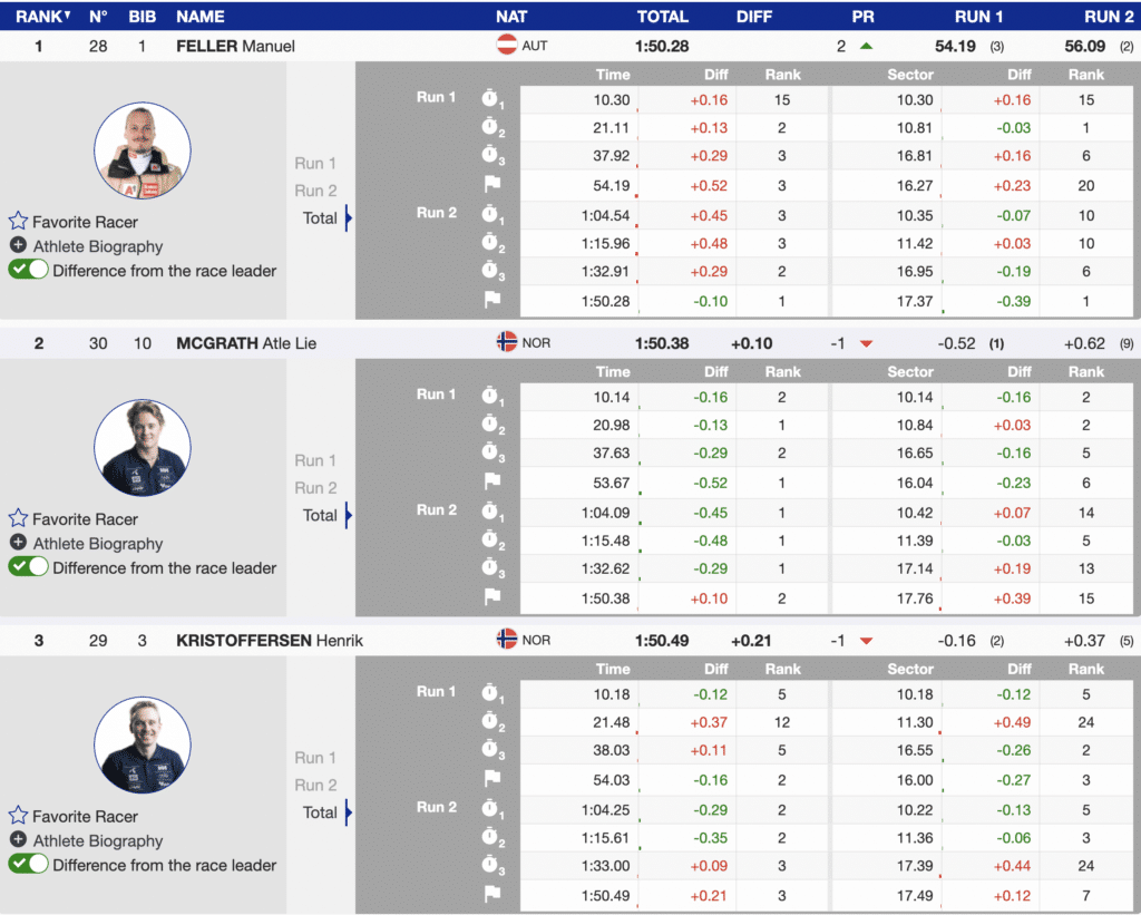 The final skier was first-run leader Atle Lie McGrath. He started the finale with a (-0.52) advantage over Feller but ended the race (+0.10) behind in 2nd place. The two also finished first and second in the last slalom race in Adelboden. McGrath held his lead until the final timing sector but lost his speed to the finish and was unable to win the race. It is likely McGrath’s day is coming soon. There are two more classic slaloms in the next ten days, and he will likely win one.