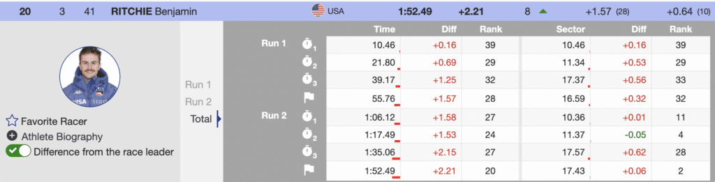 The 23-year-old Ritchie was the only North American to qualify for the afternoon run. He is a talented slalom skier who, last week in Adelboden, qualified for the first time in the 2023-24 season. Ritchie was the third skier to attack the second-run course. He built a big lead before making a costly mistake. However, the talented slalom skier crossed the finish line with the lead. Ritchie held the lead for the following three racers and finished the day in 20th (+2.21), tying his career-best World Cup result. It is excellent to see Ritchie returning to form.