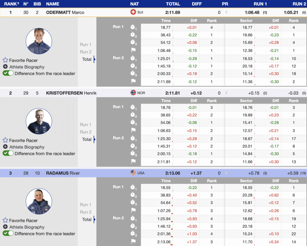 That left Stifel US Ski Team’s River Radamus next to ski. Radamus started the run with a 0.49 advantage and crossed the finish with a (0.13) lead. He was guaranteeing himself his first career World Cup GS podium. However, immediately after Radamus finished, the Norwegian veteran superstar delivered a fantastic run and crossed with a (1.25) lead. That left only the world’s best remaining at the start.