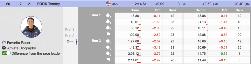 Tommy Ford, the second US racer, skied the final course. Although he skied well at the top and bottom, Ford lost significant time in the second timing sector by skiing wide onto the steepest pitch. However, he benefitted from many racers who could not finish. Consequently, Ford moved up three positions and finished the day 20th (+2.92).