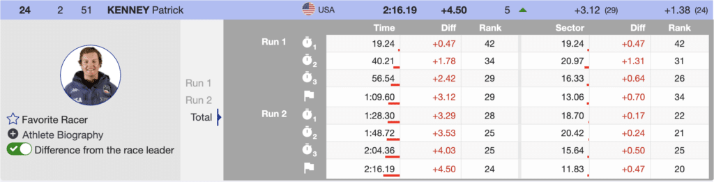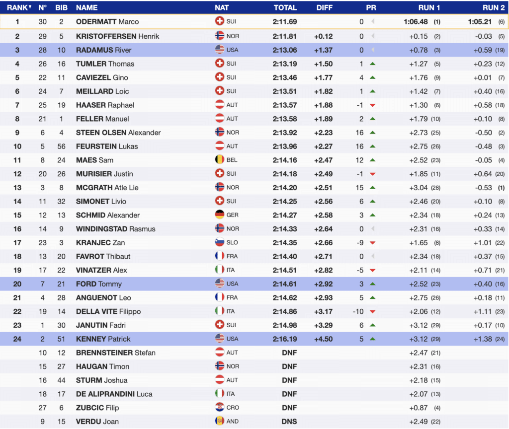 Patrick Kenney, an independent skier from the USA, raced second on the final course. Today marked the first time he qualified for a second run. As is often the case in this situation, it can be difficult to confidently ski freely, knowing that you must finish the second run to earn your first World Cup points. However, Kenney found the finish line and scored for the first time. It is undoubtedly a reason to celebrate. Kenney finished the race last of the finishers but with seven World Cup points.