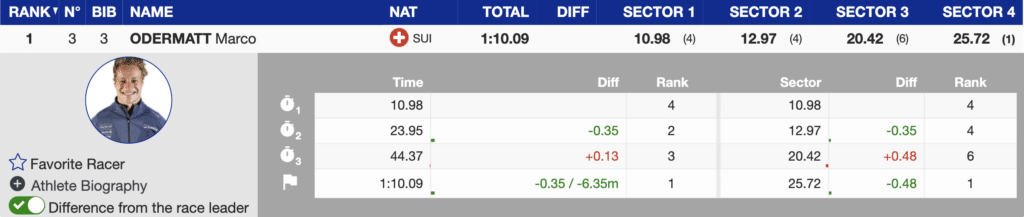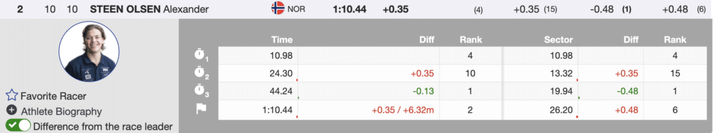 Running bib-10, Alexander Steen Olsen matched Marco Odermatt’s top interval time, unveiling his grit from the start. Through the middle, where Odermatt lost a little time, Steen Olsen’s time pulled ahead. Steen Olsen was able to maintain speed and put himself into 2nd place going into the second run, +0.35 behind the leading time.